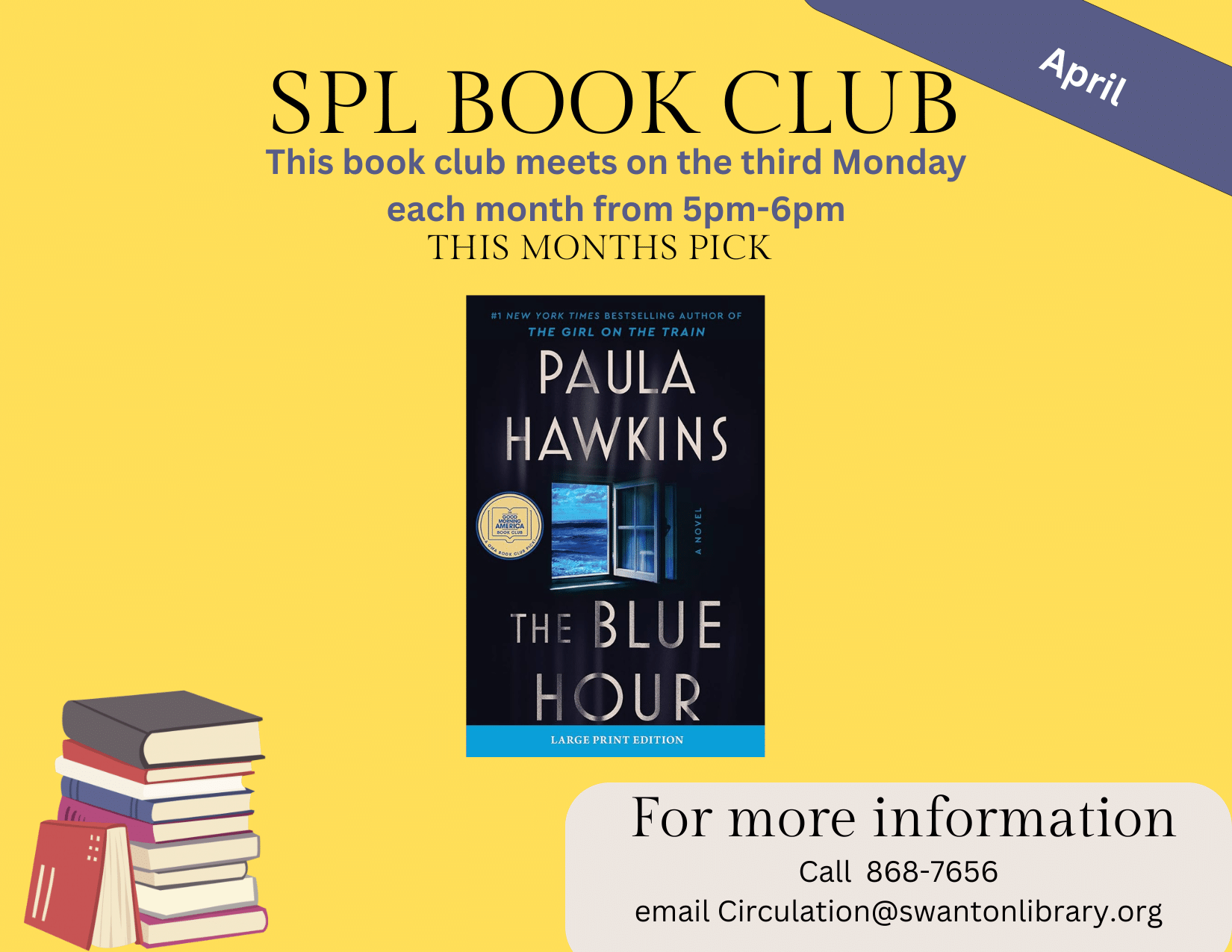 This month’s book: The Blue Hour by Paula Hawkins. Email or call to reserve a book.