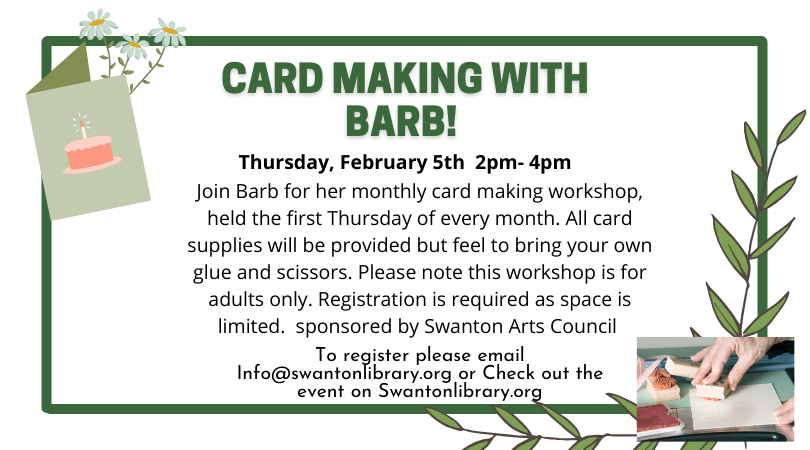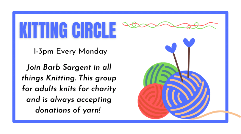 Join Barb Sargent in all things knitting. This group for adults knits for charity and is always accepting donations of yarn!