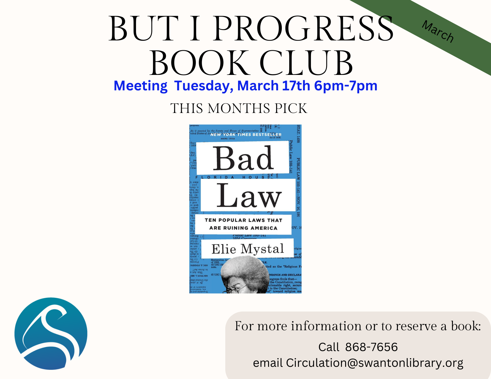 Welcome to anyone! This month's book: Bad Law by Elie Mystal. Email to reserve a book.