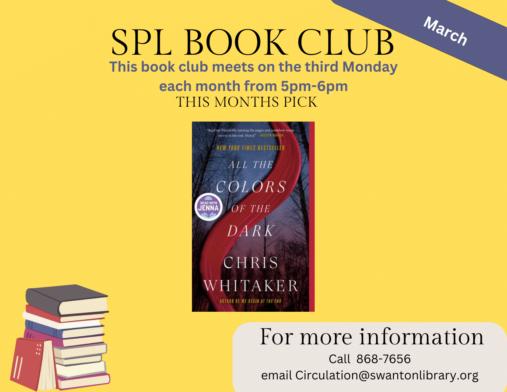 This month's book: All the Colors of the Dark by Chris Whitaker. Call or email to reserve your book.